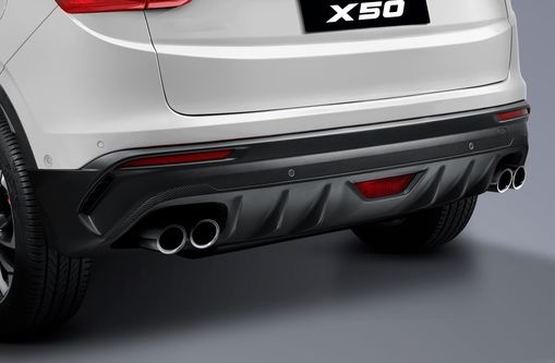 Кроссовер выглядит свежо и динамично за счет выверенных пропорций кузова и стремительных линий выштамповки. Его спортивный характер подчеркивают резко очерченные фары с выразительным светодиодным рисунком и сдвоенные патрубки выхлопной трубы. Центром притяжения передней части стала решетка радиатора с многоцветными концентрическими элементами, обрамляющими логотип. В максимальной комплектации X50 обращает на себя внимание красными тормозными суппортами.