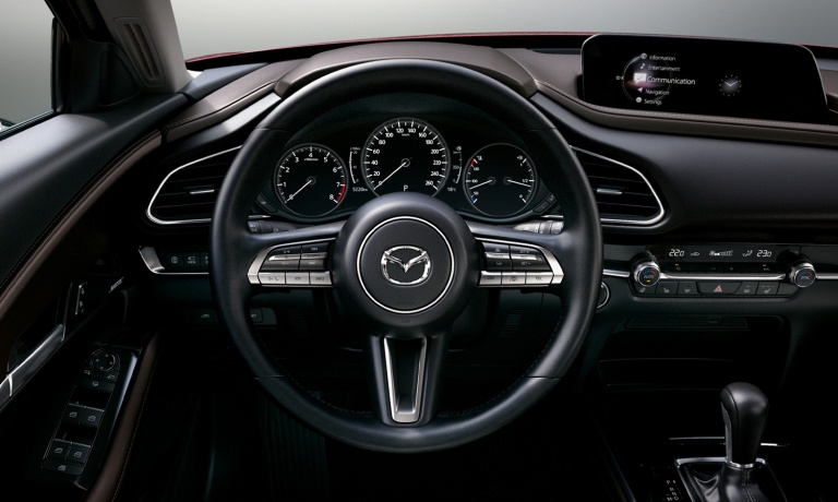 Mazda CX-30 обладает комфортабельным салоном, который является удобным для передних и задних седоков. Внутренняя отделка автомобиля оформлена в минималистичном стиле с одновременным преобладанием плавных и смелых линий. Машина оборудована мультифункциональным рулем, передней панелью с приборами и 8,8-дюймовым дисплеем по центру. Мультимедийный комплекс идет с поддержкой Apple CarPlay и Android Auto, имеет климат-контроль, подогрев передних сидений и датчики дождя и света. Помимо всего прочего, стоит отметить безукоризненную эргономику кроссовера и идеальное качество материалов отделки. Интерьер авто воспроизведен по аналогии с автомобилями премиум-сегмента. Передние кресла Mazda CX-30 имеют широкий диапазон регулировок, на втором ряду располагается диван с откидным подлокотником и вентиляционными дефлекторами.